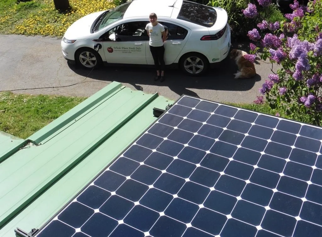 Mendocino Solar Service customer charges her electric car with power from her roof-top solar energy system. She calls it a “win-win!”